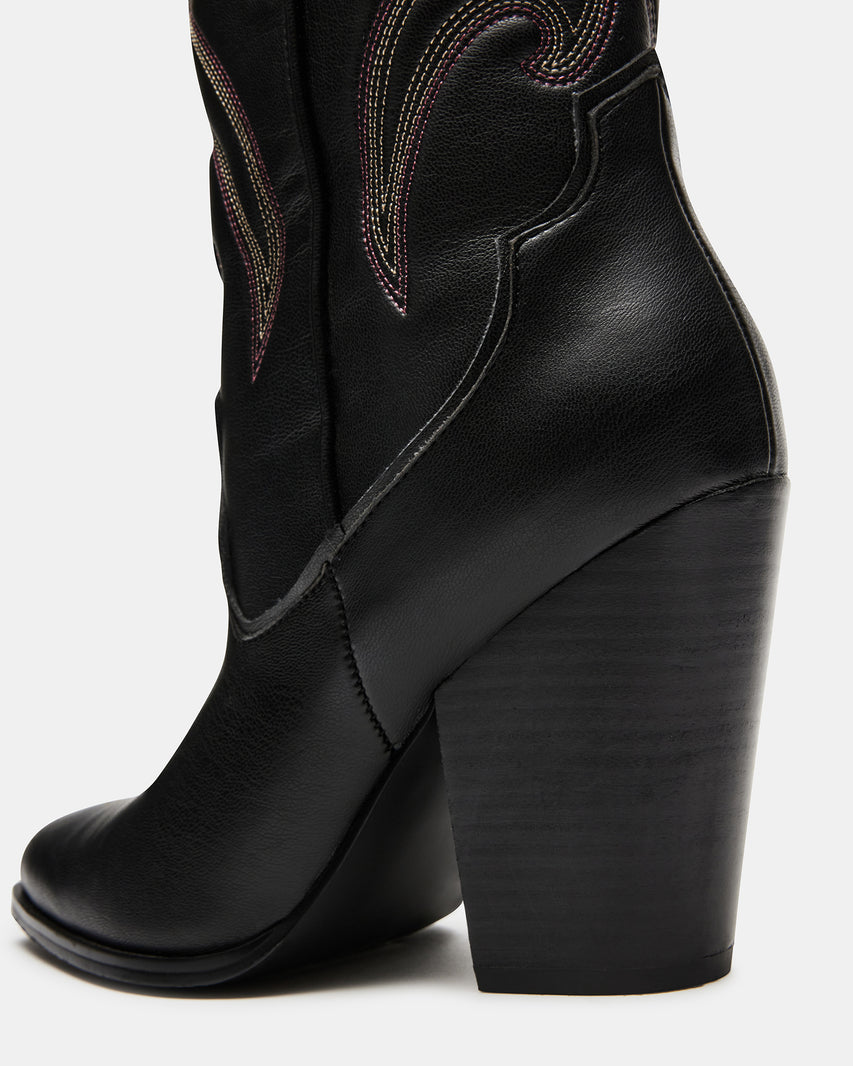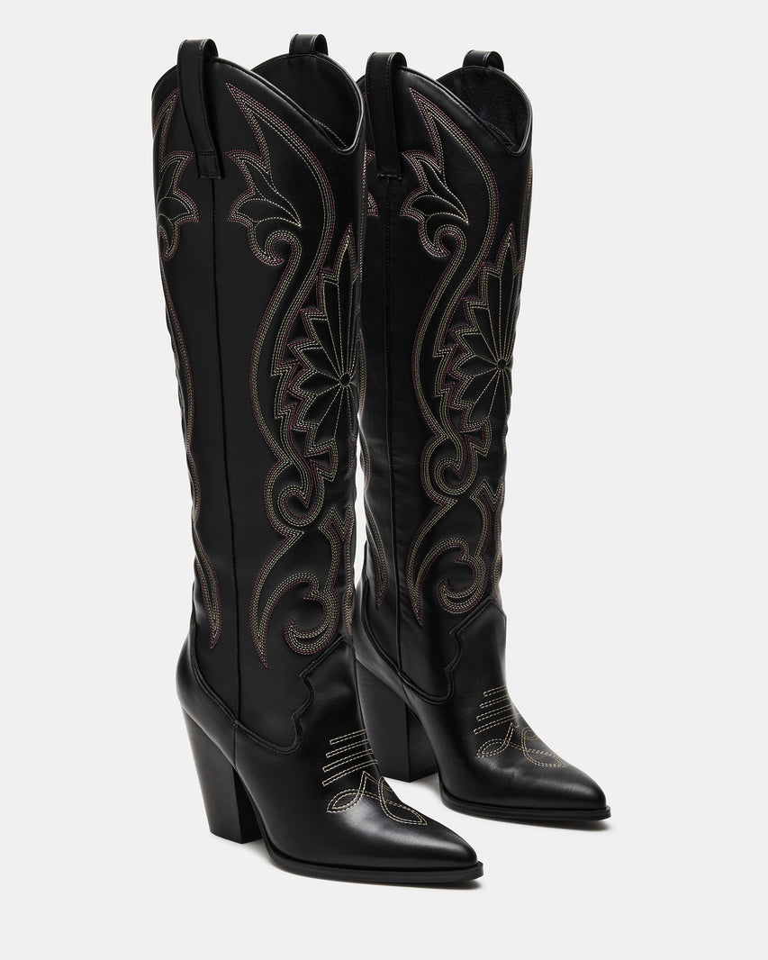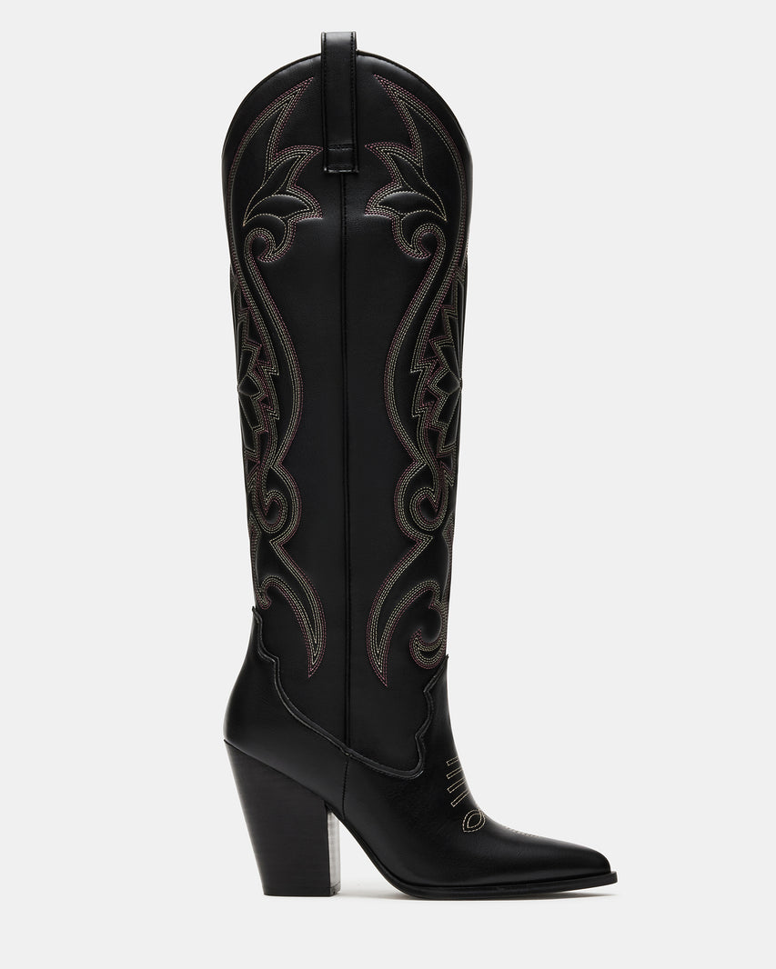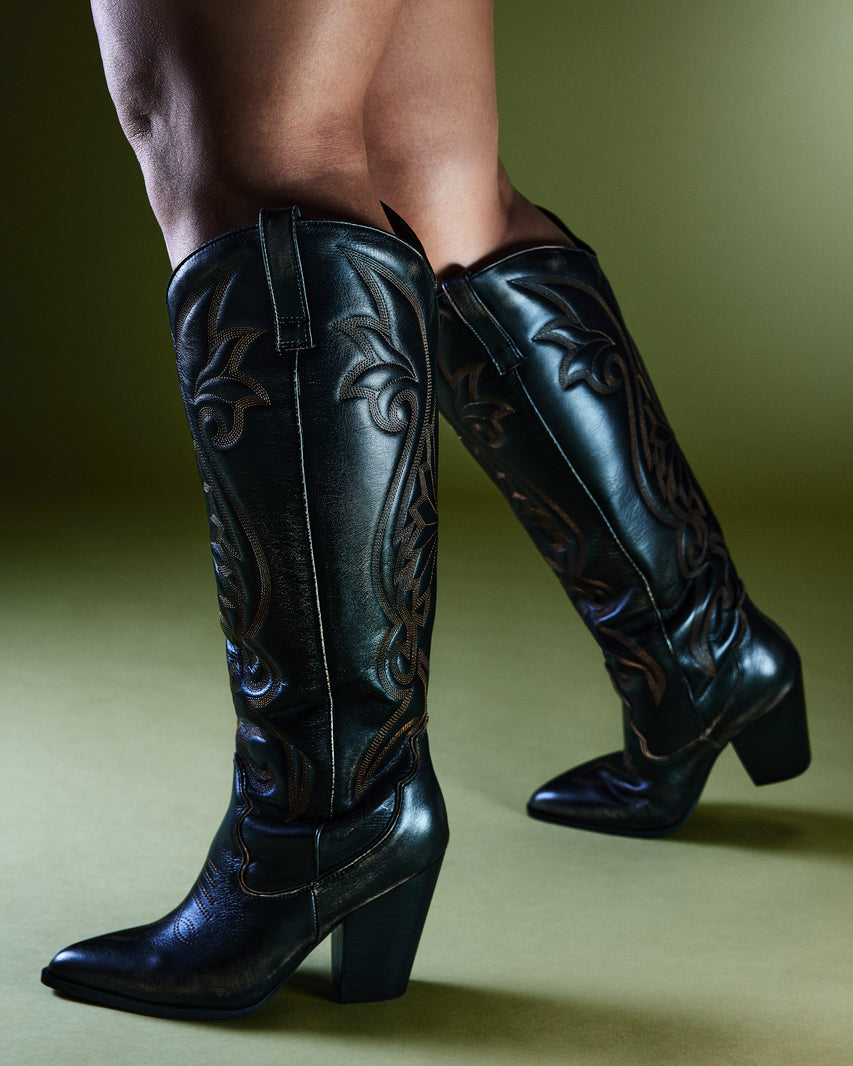 Les bottes western sont indispensables à toute garde-robe et nous sommes obsédés par LASSO. Cette paire montant jusqu'aux genoux présente des détails de surpiqûres et un talon bloc imposant.